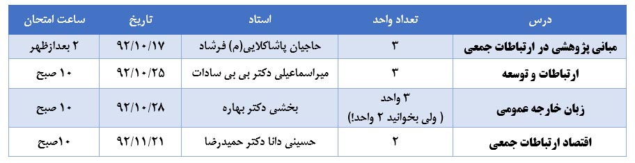 برنامه امتحانات ترم اول ورودی های 92 رشته علوم ارتباطات